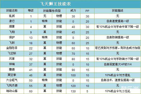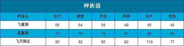 小编点评:飞天狮王,翼系第二只拥有翅膀的狮子,同样是第二只拥有神技的翼系妖怪 ——六合旺气,能够使自身法术、速度各提高一级,与光明狮王相比,它更有速度优势 。大招地动山摇有令对手混乱的几率,还拥有增加自身防御技能,对战或是打boss都有 优势,错过了光明狮王的小卡布可不要错过飞天狮王了哦!