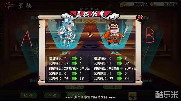 而置换功能,则可以解决这个问题:可以将A武将的武将等级、进阶等级、将星等级等内容转移给B武将。