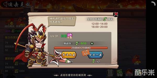 最后编辑于7年前追击克敌小提示:12:00-14:00和18:00-20:00点挑战吕布全力一击消耗的密令减半