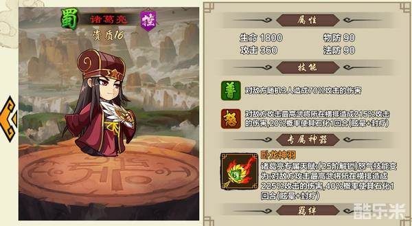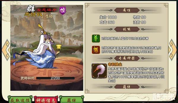 先说仙人左慈开始吧!普通对敌方随机三人造成70%攻击伤害,怒气技能对敌方怒气最高单体造成360%攻击伤害,同时50%概率禁技能,不能回复生命,果然左慈道法通天,左慈可占1,2位置先手出击,可替换贾宇出厂,单体爆发+群攻配合于吉更上一层楼