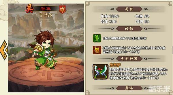 小霸王孙策可对敌方横排造成70%攻击的伤害,怒气技能有致盲效果,而且还是对横排三明敌方武将均有概率,己方100闪避对面攻击真是太强了!吴国一生推小霸王~吴国一号位霸主已定!