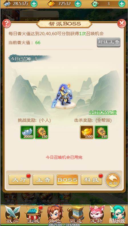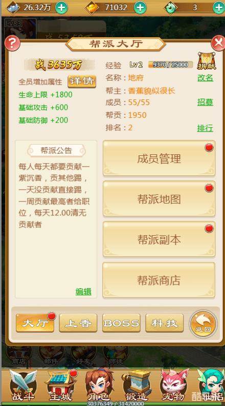 2.进入帮派后,建议每天的帮派任务尽量完成,上香看群主要求,檀木香最适合免费玩家,土豪随意。消耗帮贡可以提升属性,还可以在帮派商店里面购买各种进阶丹,对增加战力有帮助哦。