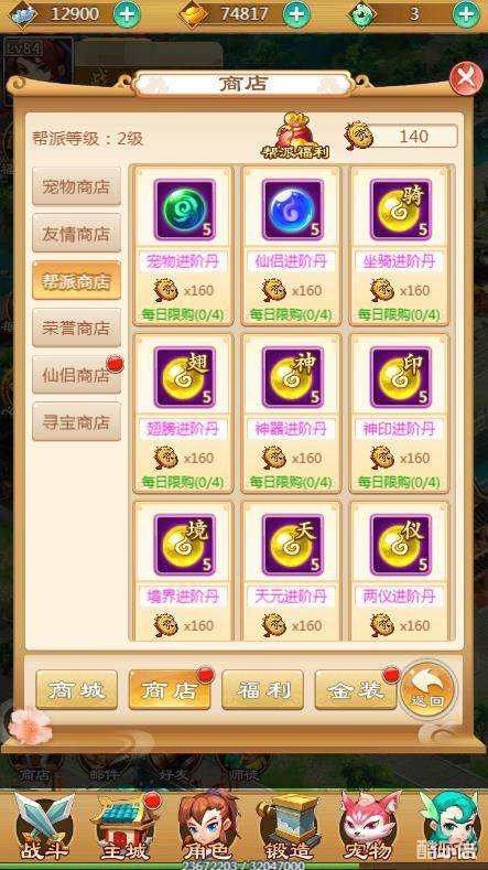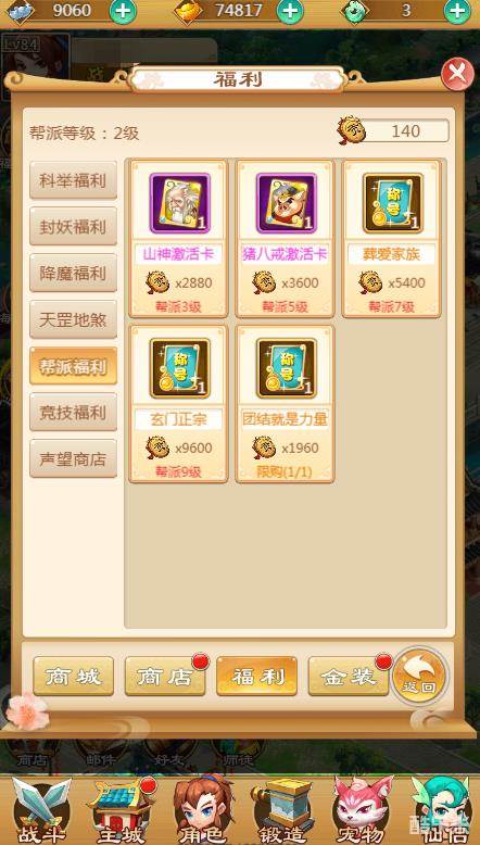 3.帮派福利。加入帮派好处多多,帮派等级的提高可以在帮派福利里面消耗帮贡兑换称号及宠物,所以不要吝啬对帮派的贡献哦~