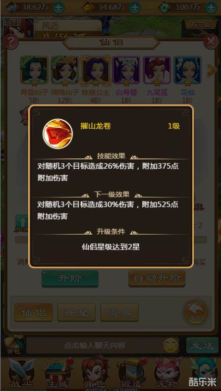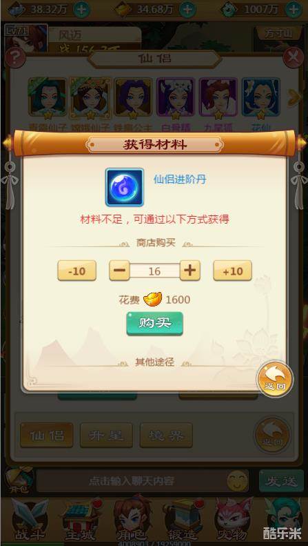 点击升阶或者一键升阶就可以消耗材料和金币进行升阶仙侣了。