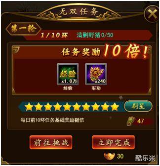 任务的星级越高获得的奖励也就越多,您可以使用刷星令对任务进行刷星。刷星令可以使用元宝购买或者用声望进行兑换,兑换的次数有限。若您嫌刷的慢,也可以直接使用元宝立即完成哦。