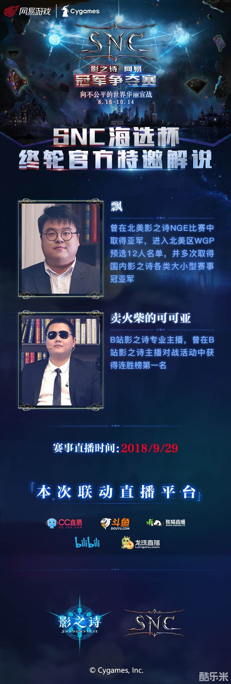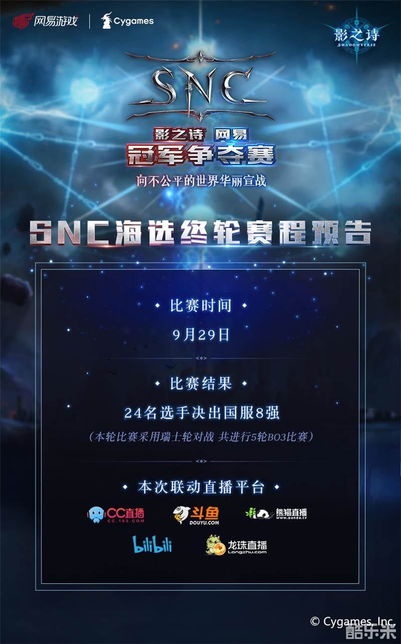海选终轮比赛将在今天(9月29日)展开,观众可以通过CC直播、斗鱼直播、熊猫直播、哔哩哔哩直播、龙珠直播平台进行线上观看比赛,共同见证SNC国服八强的诞生!