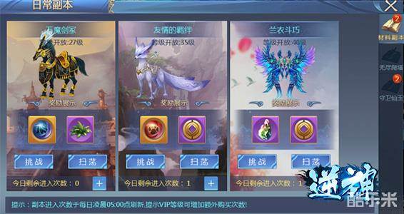 《逆神》中,玩家完成日常任务可获得vip、铜钱、经验、坐骑材料、宠物材料等奖励。