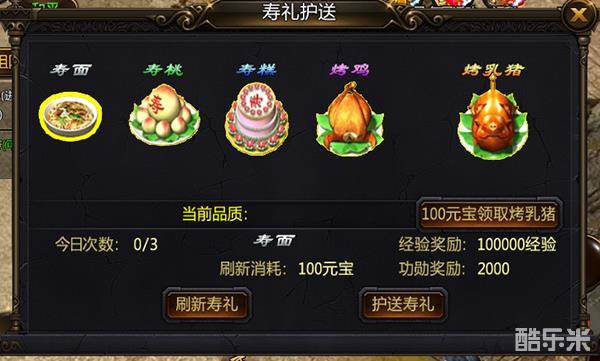 押运要领一:寿礼刷到最高级烤乳猪再领取。在《沙城争霸》游戏里,我们肯定想要每一次任务的收益都是最好的。而城主贺寿最高等级的就是烤乳猪了,当然也是能够拿到最多奖励的。刷新寿礼需要消耗刷新符,这个物品可以在商城中购买得到。