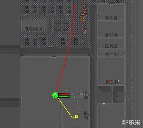 这里要注意里面的线路不是一条而是两条,看下图黄线是厨房连餐厅,红线是监狱区链接食堂(从监狱区连食堂才能连上),必须两条区域连接线都存在厨师才会做饭,,如果是吃饭时才连上的线要等到下次吃饭才起作用。