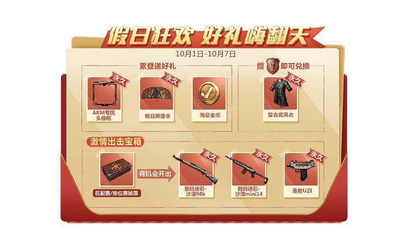 10月1日至10月7日,玩家们累计登录游戏可以获取海量金币、永久AKM专属头像框、永久假日降落伞等道具。与此同时,同样在这七天的活动时间内,所有玩家登录游戏均可领取“银质吉利手雷”道具,使用该道具可在足球宝贝套装、机能套装、战地服务生套装、青春运动套装与暴走小妹套装这5套永久套装中兑换任意一套永久套装组合,喜爱收藏的击友们一定要记得来噢。