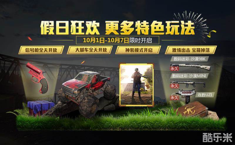 除此之外,为了给各位击友带来一个嗨到爆的假期,信号枪模式、大脚车模式、神装模式都将于10月1日至10月7日全天开启!更快的对局节奏,更紧张刺激的娱乐玩法,与敌人斗智斗勇,与小伙伴们一块儿遨游战场,假期就是要畅快地度过哟!