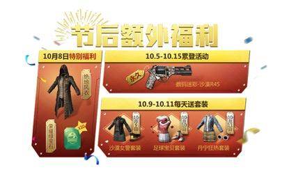 你以为这就是全部了吗?当然不会!10月5日,随着节日假期临近尾声,《绝地求生 全军出击》为击友们准备的新一轮福利将再度来袭。10月5日至10月15日,登录游戏即可领取永久数码迷彩-沙漠R45、双倍经验卡等惊喜道具。10月8日至10月11日,登录游戏还有额外10倍绿宝石道具可领。10月8日至10月11日,完成对局存活任务即可获得绝地风衣、沙漠女警套装、狂热套装、足球宝贝套装……击友们看着这一波接着一波的福利是否心动了呢?心动不如行动,快约上小伙伴们一起来玩吧!