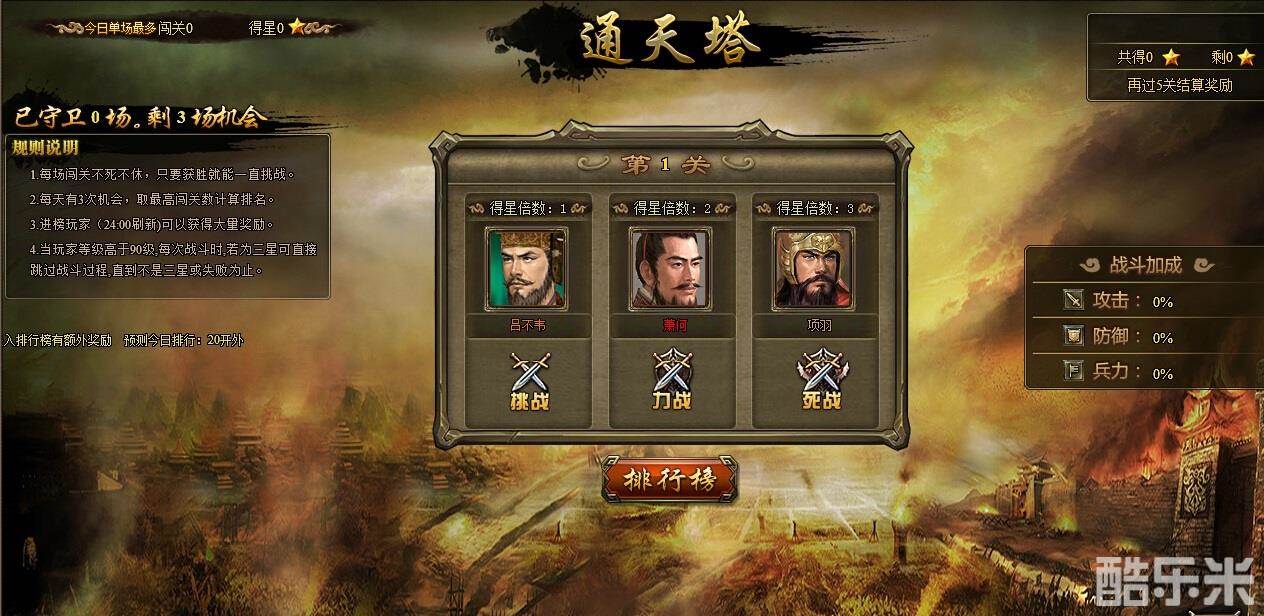 连续闯过三关,得到“兵力”“攻击”“防御”的加成,联系闯过五官,就会得到大量的奖励,