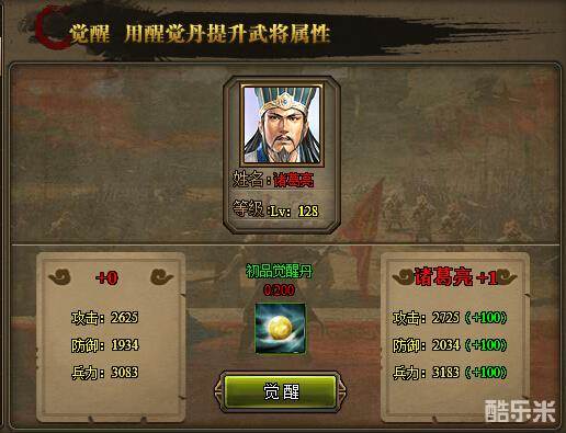 觉醒是使用觉醒丹提升武将的属性,每觉醒一次就会提供大量的全属性加成。