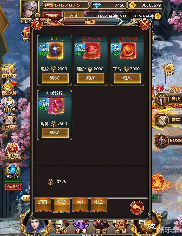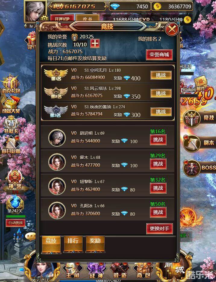 《诸神召唤H5》竞技场挑战第一名奖励400元宝、第二名奖励350元宝、第三名奖励300元宝以此类推,元宝当然是随玩家自己,想买什么就买什么了,另外获得的荣誉可以购买多个稀有道具,包括幻羽、宠物成长丹、坐骑成长丹、神装碎片等等都可以购买。