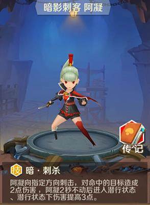 刺杀:阿凝向指定方向刺击,对命中的目标造成2点伤害,阿凝2秒不动后进入潜行状态,潜行状态下伤害提高3点。