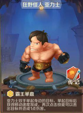 霸王举鼎:亚力士双手举起身边的目标,举起目标后亚力士会获得短暂的移速加成,再次点击技能可以丢出目标并造成1点伤害。