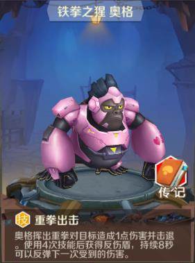 重拳出击:奥格挥出重拳对目标造成1点伤害并击退,使用4次技能后获得反伤盾,持续8秒可以反弹下一次受到的伤害。