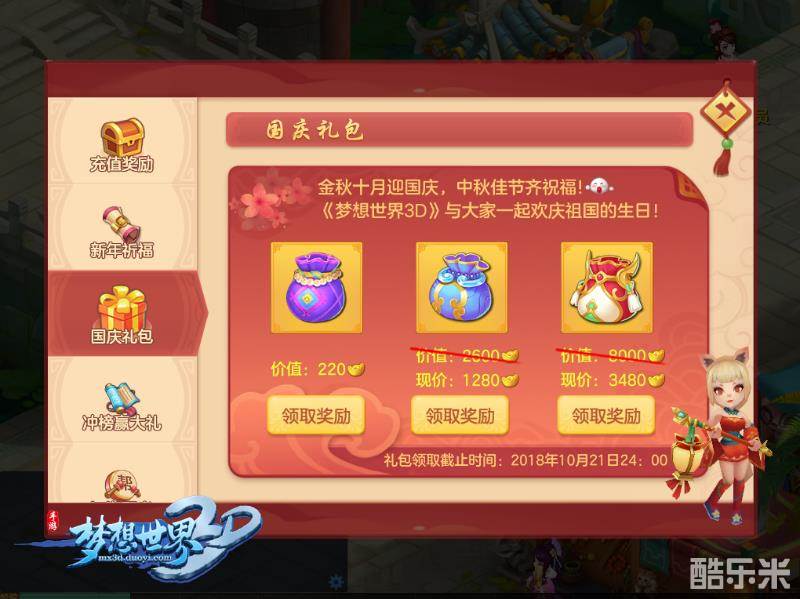 国庆礼包不间断!第一重假期签到礼包,连续登陆能获得超级宝图在内的各种惊喜奖励!第二重国庆狂欢礼包,每天简单日常即可免费拿礼包,更有超值礼包4折出售,这个国庆玩什么?必须上《梦想世界3D》拿礼包!