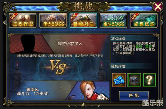 参与方法:在主界面,挑战界面,点击巅峰对决参与,选择平匹配之后进入等待倒计时,点击取消则停止匹配。