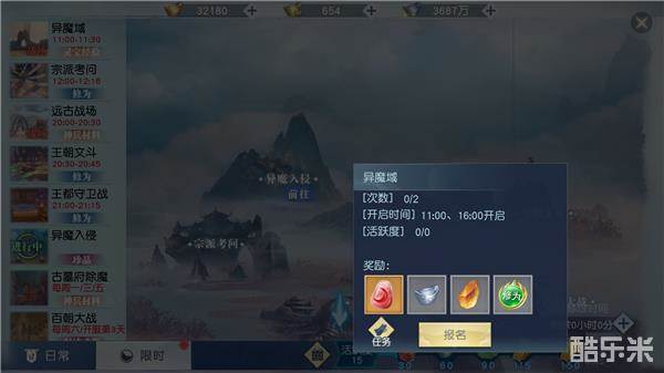 虽然异魔已经除尽,但是异魔域中依然充满危险,所以不能随意进入,只有每天的11:00~11:30,16:00~16:30才会开启,其它时间不会开启。异魔域对于战力和等级没有硬性要求,想来也是为了让更多的青年才俊进去历练,不过在进去之前要掂量掂量自己的实力,做好万全准备,不然进去之后成为别人的炮灰也只能苦笑三声了。