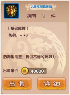玩家初期法宝品级选择应以蓝色法宝九龙神火罩、番天印为主。