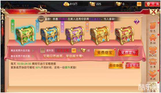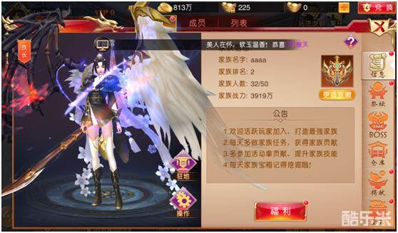 进入家族很大一部分原因就是为了获得家族福利,所以进入家族后我们可以看到家族福利界面的众多福利内容,包括家族签到奖励,完成帮会任务后获得的家族工资,家族成员捐献家族后领取宝箱的家族金库,活跃家族的家族管理员可以在管理分红中获得金币分红,当然也少不了家族新成员加入时自动发送的迎接萌新的迎新词。