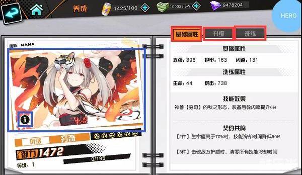 ?点击左侧的立绘可以直接查看立绘大图,点击立绘图中“i”可以查看立绘的故事和声优配音。在右侧可以查看契约属性、升级契约、洗炼契约。