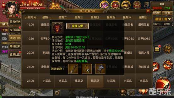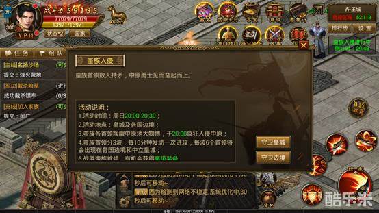 蛮族位于偏远蛮夷之地,觊觎中原富饶,蠢蠢欲动。每周都聚集兵力疯狂入侵中原。蛮族首领每次有6个出现在各国边境和中立皇城,没10分钟发动一次进攻。需要天下英雄共御外敌,战胜蛮族首领,获得高级装备!