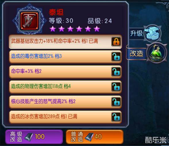 以图片中的武器为例,已锁定1,3,4号属性。继续改造,将失去紫色的命中率+12%和橙色的暴击倍数+13%。这两个属性已经很好,如果新改造的属性出现低级属性则得不偿失。此时选择高级改造就是明智的选择。高级改造消耗的铁比较多,如果铁不足可以试用钻石代替。虽然消耗较大,但是需要使用高级改造的情形并不经常出现。
