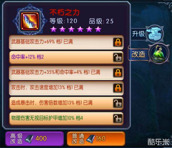 你最多只能锁定3条属性,剩下的3条只能靠运气了。当你已经获得了心仪的属性,却仍然想继续改造时,建议选择高级改造。这样,如果你改造出的属性不满足你的要求,可以选择放弃,放弃后会还原为改造之前的属性。