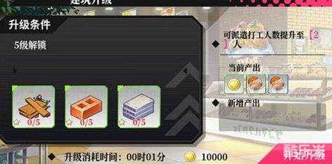 右下角可以选择对当前建筑进行升级,升级则需要消耗对应的建筑材料和金币,升级完成后可提升打工人数,打工结束后得到的奖励也会比原来更丰富。