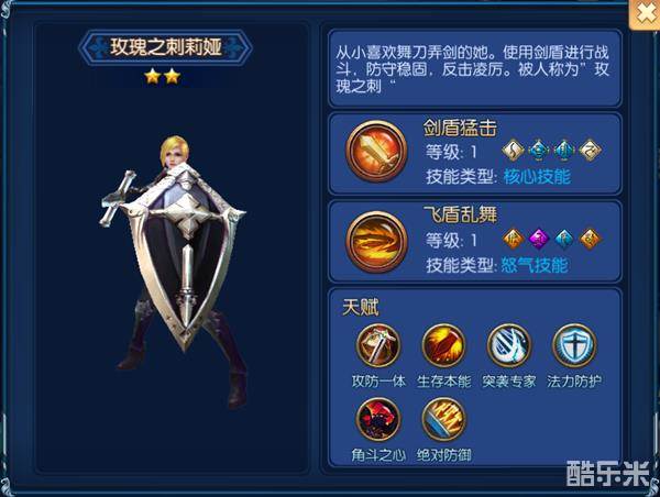 既然玫瑰之刺莉娅是一个防御型战士,那么肯定在培养时对于生命,防御,格挡等防御型属性的投入,价值会更高一些,首先我们来看看她的技能