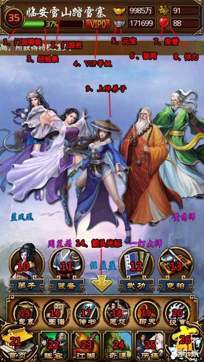6、银两:当前门主所持有的银两数量,可以用来强化装备、参悟武功、兑换荣誉等等。