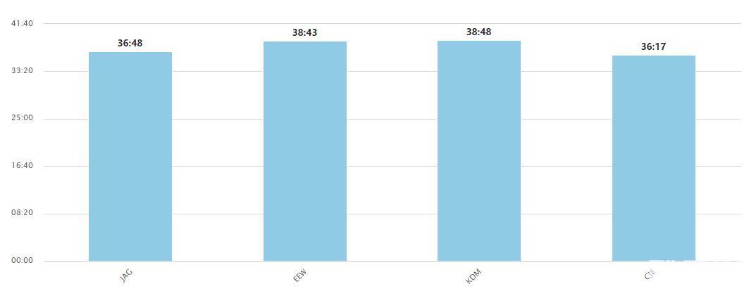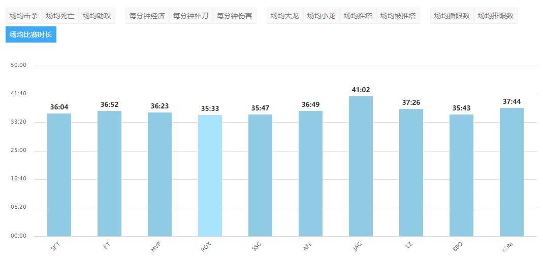 Jin Air在LCK春季赛中的场均游戏时长为41分02秒,位列LCK第一,领先排名第二的KDM 3分18秒。