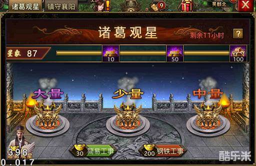 3、星象值达到指定值时,可建造工事增加,陨铁奖励增加,并可获得“孔明锁碎片”或“孔明锁”;