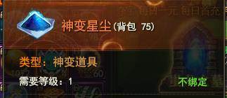 龙神契约更新之后,神变星尘掉落怪物范围已经扩大到100-150级所有怪物(不含boss),在连服战场、野图和天空之城挂机都可以获得神变星尘了!