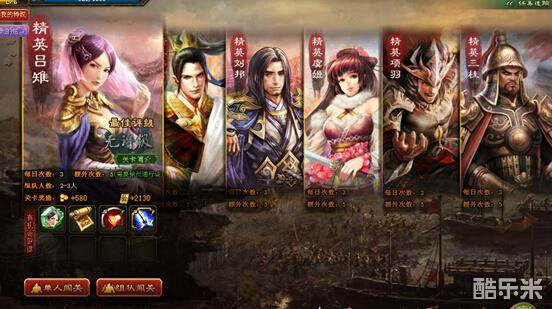 精英关卡有进入次数限制,但是不消耗疲劳,可以选择单人挑战或者组队挑战,单人挑战和普通关卡一样,需要1名主将2名副将,而组队挑战可以和其他玩家一起挑战。获胜之后可以获得英雄碎片、宝具分解卷和主印碎片。精英关卡无法扫荡。