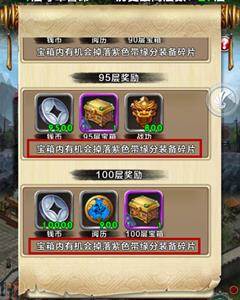 攻下每层必得无双币奖励,特殊层则会有钱币、凝魂散、阅历、战功等各类奖励,特殊层的宝箱更可开出各种装备碎片哟~