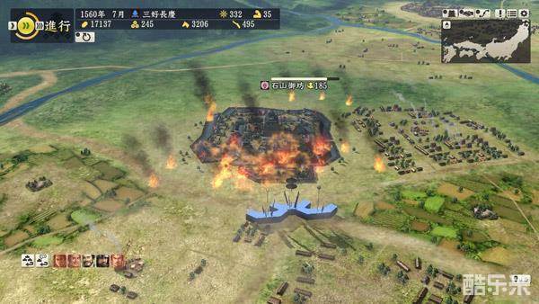 对据点放火的场景,放火是用来破话据点范围内的设置,能够降低民忠和发展度,进攻方还能获得兵粮。
