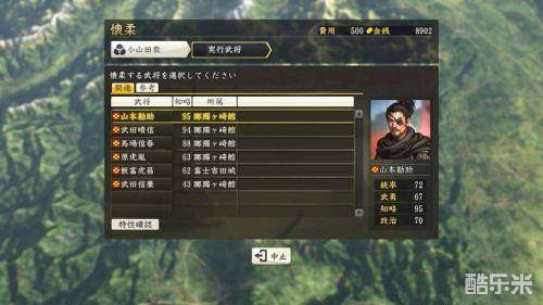 在实行怀柔选择武将的画面中,会有预测支持率上升的确认画面,如果是知略高的武将,就可以是怀柔的效果更加发挥。例如选择知略高的山本堪助作为实行武将的话,就可以期待支持率能有较大程度的上升。