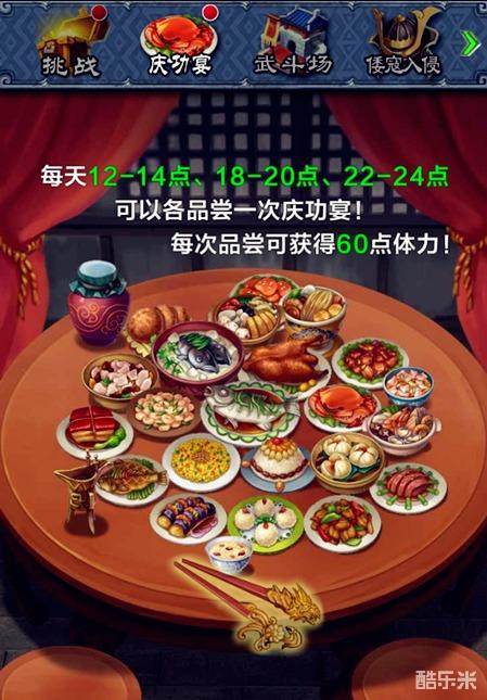 每天12点-14点,18点-20点,22点-24点,点击【活动】-【庆功宴】,点击品尝界面中的美味珍馐,即可回复大量体力哦