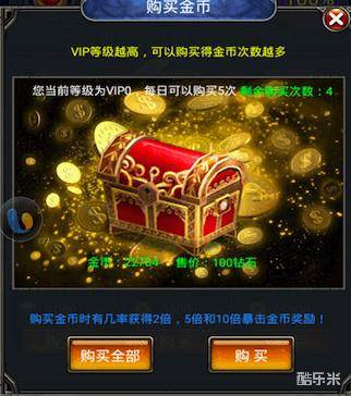 商店购买是获得金币最多的地方,VIP0每天可购买5次。有2、5、10倍暴击概率哟,后续增加VIP还能获得更高购买次数,花费小量的钻石即可获得十万金币,人品好时或许会有百万的金币。