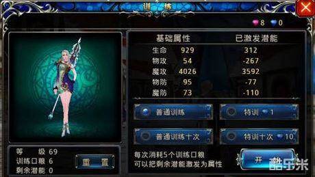 潜能点数的合理分配是:每4次训练到主属性(魔攻、生命)上时,需要3次训练到废属性(物攻、双防)上。