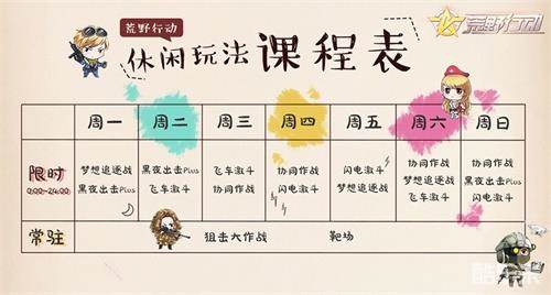 休闲玩法梦想追逐战、黑夜出击Plus、飞车激斗、协同作战、闪电激斗现已加入荒野“豪华套餐”,各位荒野精英每天都可体验到不同的休闲玩法。而狙击大作战和靶场则会每周常驻,各位玩家可以尽情叫上三五好友组队当“狙神”,称霸整个荒野大陆!五种玩法“轮班上岗”,你会pick哪一天?
