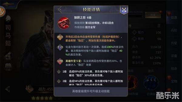 可以看出,这技能可以说是非常有特色的120武将技能。“死得越惨,爆发越高”。技能描述不难理解,技能伤害跟自身前2回合受到的伤害是成正比的。第三回合释放,并且只有第三回合才有爆发输出。所以司马懿阵容必须以司马懿为核心搭配。3回合须一击致命,或者后排队友能辅助3回合清场。这对于司马懿来说都是特别重要的。由于技能机制,司马懿的输出跟自身损兵成正比,所以司马懿pk很强势,但是用于国战就比较鸡肋了。