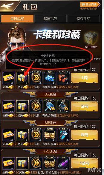 第一种为每日必买,礼包就和它的名字一样,每日只能购买一次,但是因为优惠力度太大,不会计入首充、累积充值活动中,每日必买的礼包,压根就不需要对比啊,无论是1、3、6、12元的礼包(只能R买,不能用金条的),简直就是白给一样,而且各种超值!还可以增长VIP等级,并且有机会获得SS卡维利碎片,即使没有获得也会获得S等级的碎片一个,想想就是心动礼包呢,为什么每天只能买一次呢?
