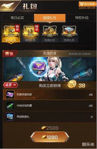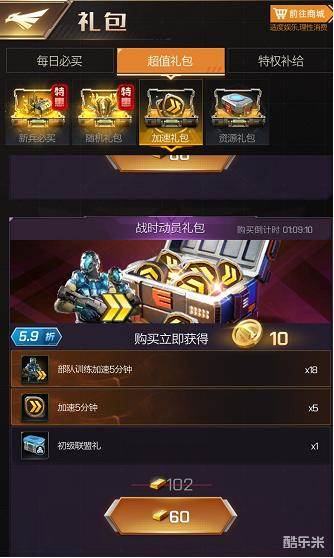 第二种为超值礼包,每个礼包都是有时间限制的,会有购买倒计时的提示,每天24点会自动刷新,其中分为新兵必买、随机礼包、加速礼包、资源礼包4种: