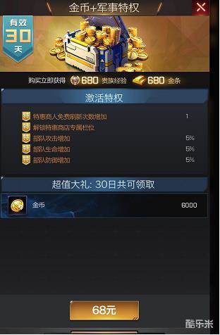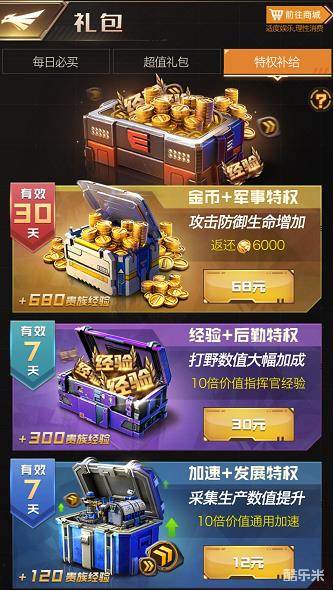 特权补给的就不用多说了,上面都有详细的介绍,建议买30天的金币与军事特权一直购买,7天的经验与后勤特权前两周购买,7天的发展特权从第3周开始购买,因为军事是一直需要的,玩游戏不打仗,和咸鱼有何区别?前两周大家等级大概能到28级,28级之后升级太缓慢,而且经验的意义不大,战略的加点提升已经很慢了,所以二周后经验特权就弱化了一些,7天发展当然是要第三周开始啦,因为中期发展需要大量资源。