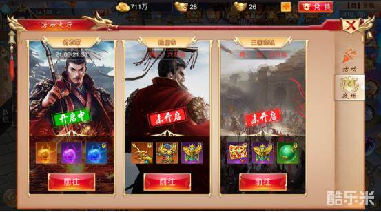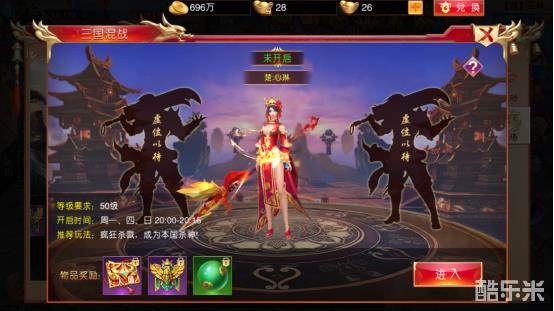 三国混战是等级到达50级以后,每周一,四,日晚上20:00-20:15开启的一个PVP的玩法,玩家进入活动,以国家为单位进行战斗。战场内击杀或者协助击杀玩家可获得积分,战场积分按个人积分排名。